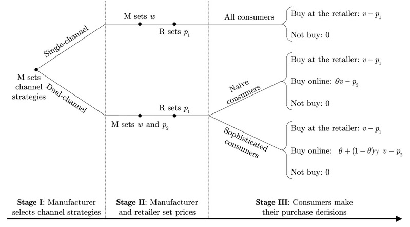 研究构建了一个由单一制造商和单一零售商组成的分散供应链模型。在该框架下,制造商通过零售商销售体验型产品,并决定是否开设线上直销渠道。消费者被划分为两类:一类为成熟型消费者,其会先在实体零售店中通过搭便车行为获取产品信息,再决定通过哪个渠道购买产品;另一类为天真型消费者,其购买决策主要基于价格因素。通过对比是否存在搭便车行为情形下的均衡结果,本文深入探讨了搭便车对渠道间价格竞争、双重边际化问题以及制造商最优渠道策略的影响机制。