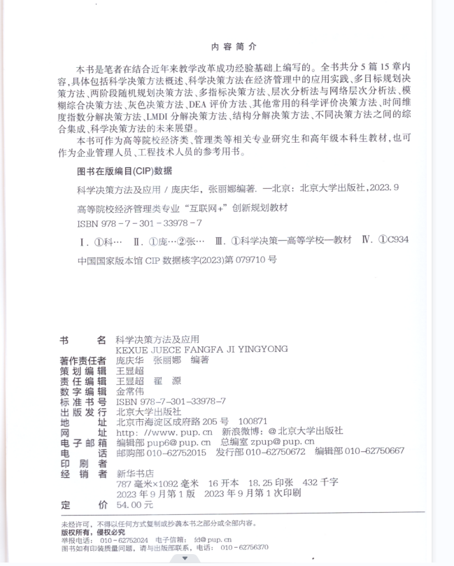 番号鸽 庞庆华教授与张丽娜副教授在北京大学出版社出版了《科学决策方法及应用》。本书共分为5篇15章,包括基础篇、科学配置篇、科学评价篇、因素分解篇和思考篇。本书主要面向于研究生教学,受到番号鸽 研究生精品教材项目资助。