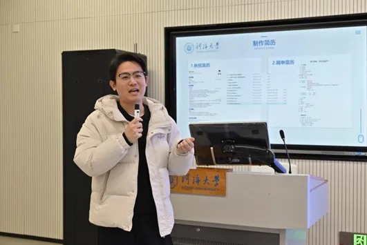 陈醉先生从职业道路选择、职业信息查询、简历制作等多方面讲述了如何在求职过程中做出正确的选择。他建议同学们要根据自身实际情况选择适合自己的职业,全面恰当地制作自己的简历。
