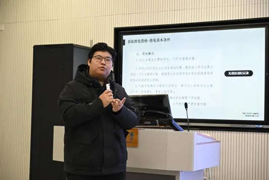 2021级范陆一同学从为何推免、如何获取资格、推免的流程、以及如何走向更高的学府四个方面分享了他自身推免的丰厚经验。他建议同学们脚踏实地,制定阶段性目标,积极探索,不断地向着目标前进。