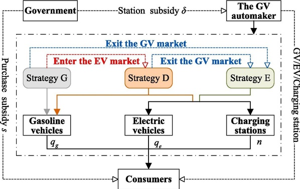 在此背景下,本文旨在系统探讨传统GV制造商在面对不同政策激励时,如何战略性地规划车型生产与充电基础设施建设,从而推进电动化转型。具体而言,本文构建一个涵盖政府、传统车企与消费者的决策框架(如图1所示),分析其在一个决策周期内的相互作用。在该框架中,传统车企可选择仅生产燃油车(策略G),或同时生产燃油车与电动车(策略D);若选择策略D,还可进一步选择退出燃油车市场,专注生产EV(策略E)。政府则可在三种政策中择一实施:无补贴政策(N)、仅向消费者提供购车补贴(P)、或仅向车企提供充电站建设补贴(S)。通过对上述策略组合的均衡分析,本研究将揭示不同补贴政策如何影响传统车企的最优生产及充电站安装决策及其电动化转型策略,为政府制定更具针对性的EV激励政策提供参考。